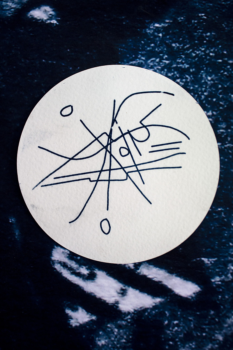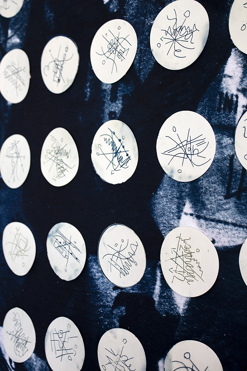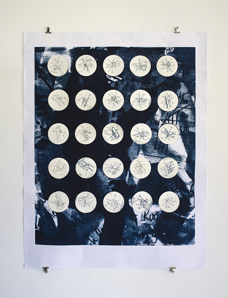 small cyanotype prints and an enlarged print of a cyanotype. 25 Days documents