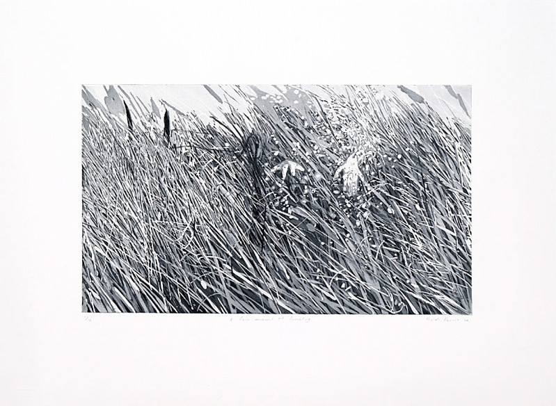 For this work, Fourie overlaid two photographs – a grassland scene and an underwater scene – and used the resulting composition as her reference image. Fourie likes the contrast between images of grass and underwater scenes, but also the similarities between the way plants move underwater and how they move in the wind. Merging the images creates the illusion of the figure swimming through the grass. This image is a direct reference of Fourie’s exhibition title, Grass You Can Swim In.
