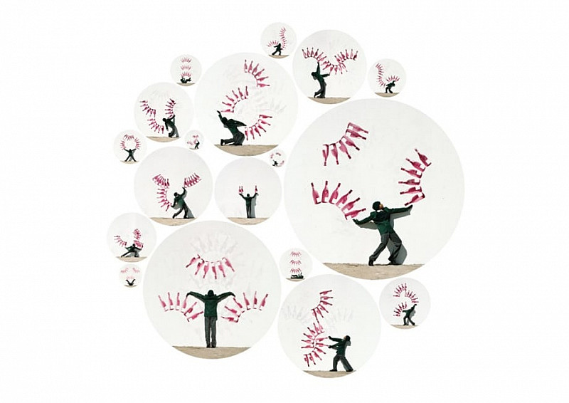 In the photographic work titled ‘Balthazar’ we see a young boy dressed in a school uniform, first carrying, then juggling, 3 large wine bottles that are painted onto the wall surface. The title of the series references the wine bottle size referred to as the Balthazar, but also touches on a religious connotation of Balthazar the biblical Magi who visited the infant Jesus upon his birth. Wine is a central symbol of transformation, juggled here by the young boy.