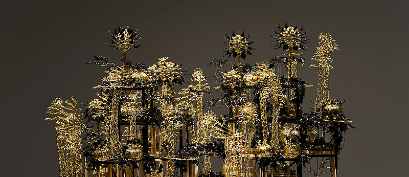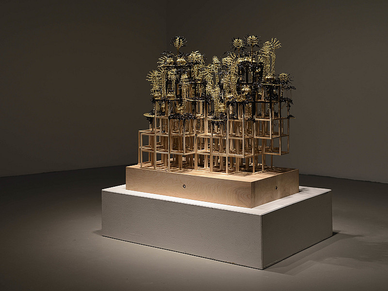 ‘Inspired by Seattle’s rapid development Curran folds organic and industrial imagery into a starkly beautiful kinetic environment. Composed of liquid plastic, brass wire, and a wooden scaffold “Bequeath these Seeds” crawls with a simulacra of life’ (Curran 2021).