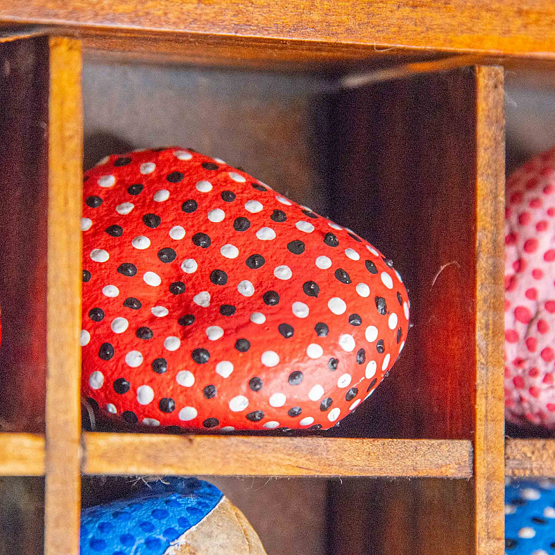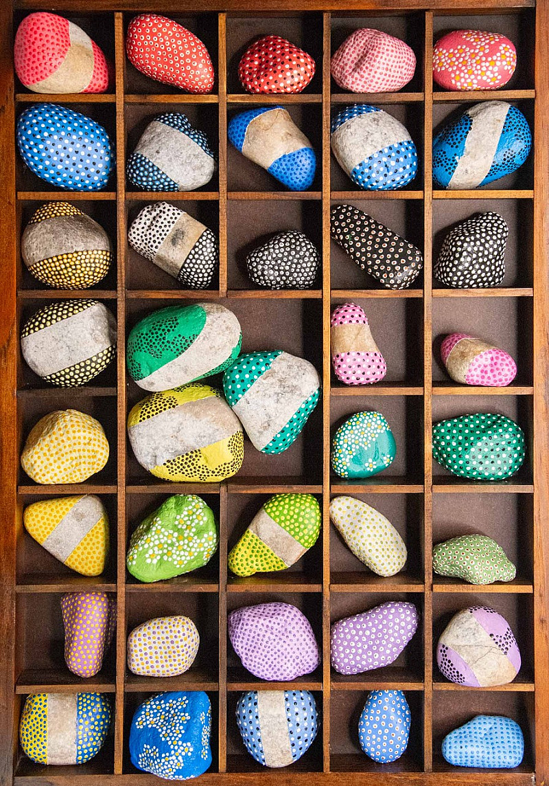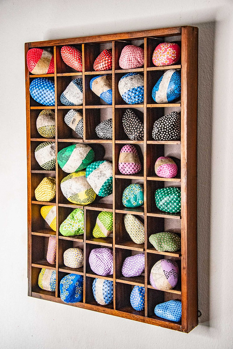 Within this installation the printers tray becomes representative of my early childhood, where I collected and arranged found objects which I thought to be valuable in their uniqueness, as an escape mechanism. The painted rocks are placed neatly, fitting perfectly in their designated slot as if it were the rocks original home, creating a sense of belonging. This considered work reflects the emotional state I found myself in at this age, an idyllic period of my life that I reflect upon often as a young adult.
