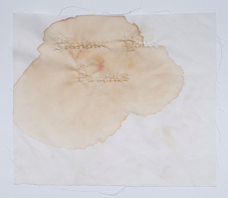 Ten Commandments is a piece consisting of ten different embroidered pieces of cloth. Each piece of cloth represents a commandment. The commandments are embroidered onto the white cloth in white thread. The shear whiteness of these commandments represents their holiness and the manner in which they should be respected. However, not all of the commandments remain clean. The commandments that I have broken are filthy. They have been used to aid in completing my everyday tasks, whether it be washing/ colouring my hair, washing the dishes, mopping the floor, bathing or even drinking coffee. The commandments that are kept clean and pure are those which I have yet to break. The commandments are displayed in the order in which they were broken.