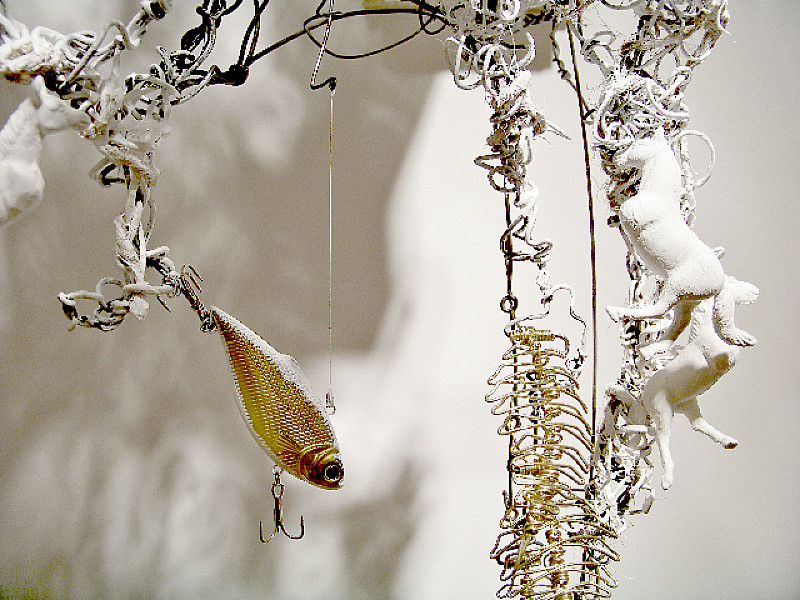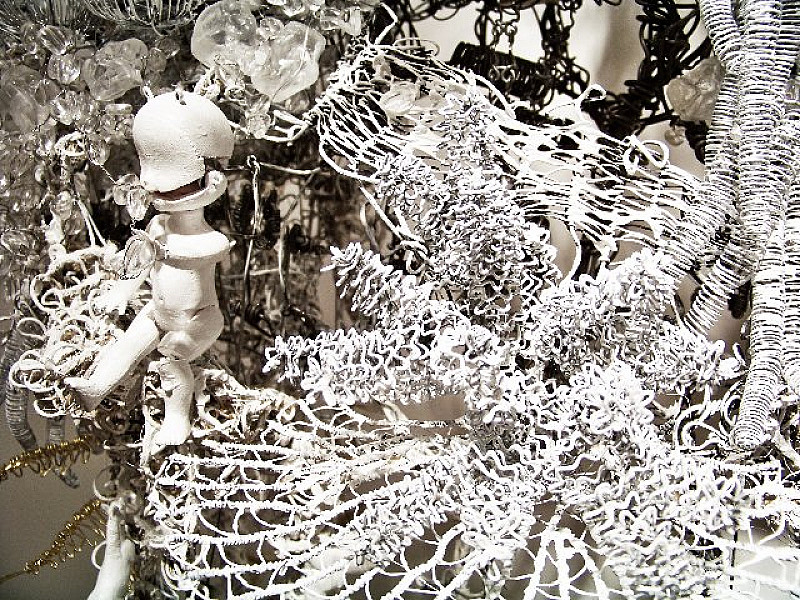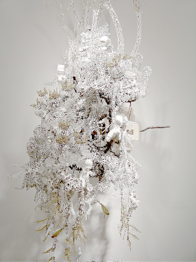 Environment #1 "addresses both the marine environment and the fusion of plastic waste by creating miniature ecologies from cultural garbage. Among the coral and crinoids (made of tinsel from gift wrap) and cranes with wings made of folding fans, one finds faceless, impish figures fucking and consuming" (O 2012).