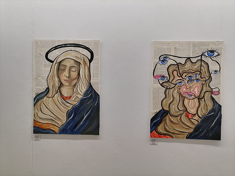 The artwork “Maria Orantes” (Praying Mary) is a diptych of the biblical character, the virgin Mary, that represents how blurred and unclear our relationship with God becomes if we keep on fixating on every single detail and being obsessed with having all of our questions answered instead of having a relationship with God. It is meant to confuse the viewer to mimic the confusion Christians bring upon themselves due to their hyper fixation on things that are ultimately insignificant. The clear image of Mary being the message of the Gospel, and the blurred image the way we distort the message of the Gospel due to our tendency to overthink, over analyse and pick apart every single detail, instead of just being with God.”Crucem Iecu” (Crucifixion of Jesus) is the main piece in this collection that also deals with how we complicate our relationship with God if we keep overanalysing every single detail. The crucifixion is the main message of the Gospel: