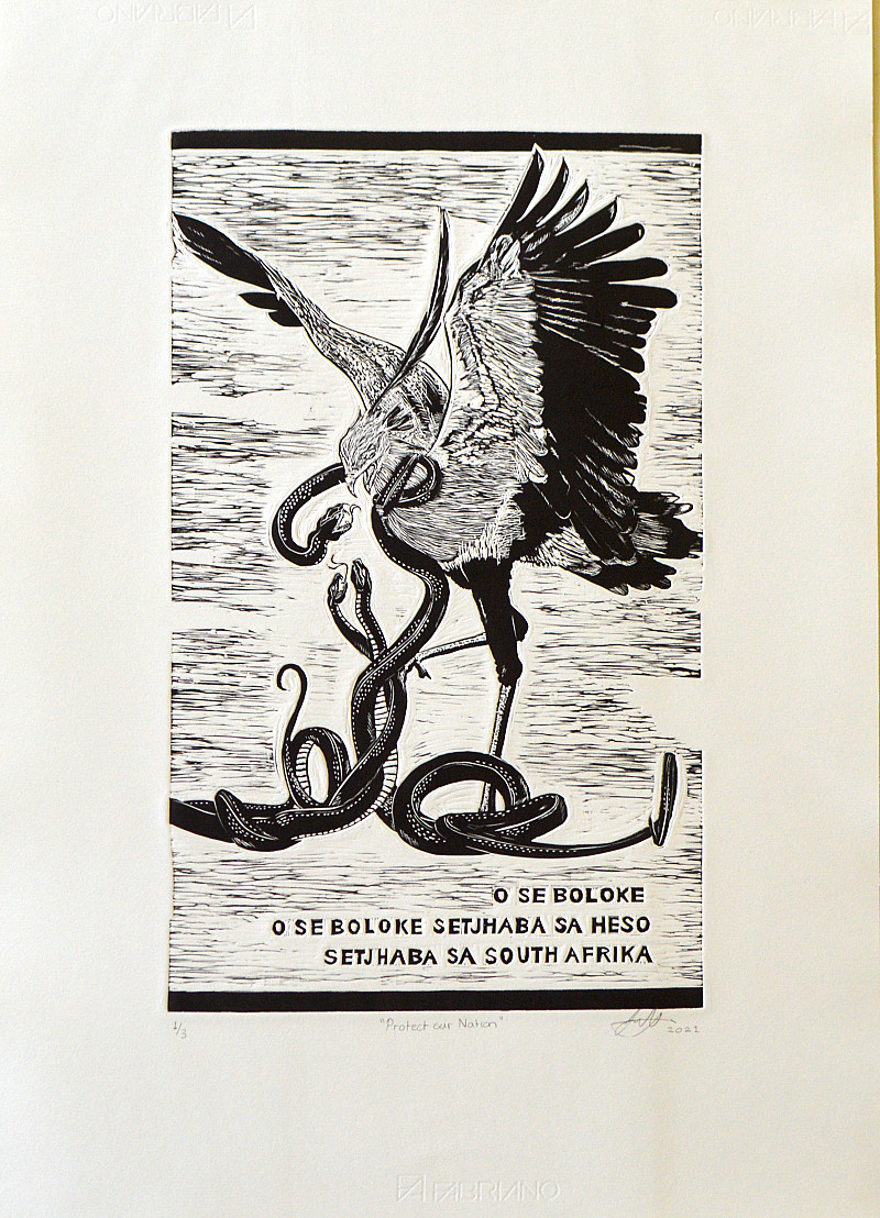 In this artwork a proud Secretary Bird with wings spread is portrayed in a battle with 3 snakes trying to overpower it. The Secretary Bird (symbolising protection and victory) representing the ideal leader, the leader we need; while the snakes represent the corruption amongst the leaders we have. The Artwork has a “propaganda” or “recruitment” feel to it, especially because of the phrase, from the national anthem, asking for protection. The black banners at the top and bottom further promote the propaganda poster feel. The artwork has a patriotic message, requesting for the salvation of our land and government: “It is time to face the Secretary Bird”.