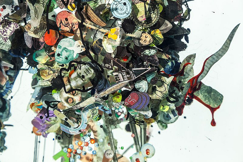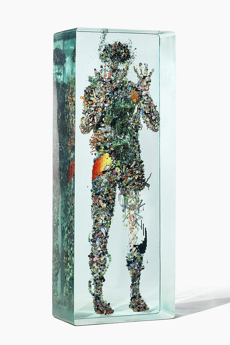 "Psychogeographies" is made up of six sculptures composed of glass encasements that enclose intricate 3-D collages in the shape of humans. These artworks were displayed in a public courtyard on the 15th of October 2015, close to Sunset Boulevard in Los Angeles as part of a permanent outdoor exhibition (Nast 2015).