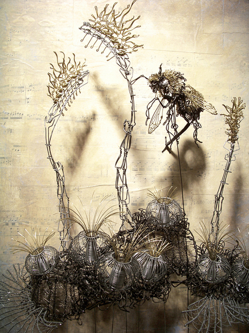 In the Oceania series we view "Seascape with bee", 'which mixed representations of life from marine and terrestrial gardens. Dragonflies and bees hover over clusters of coral on panels with a warm decoupage of sheet music. I am personally leery of this technique, which in less capable hands can become kitsch or poster art, but here the linear, speckled texture of the music seems to complement the fusion of sea, earth and sky in the affixed sculptures' (Flock 2013).