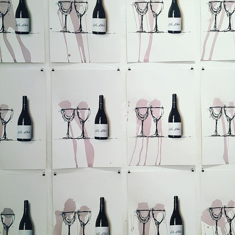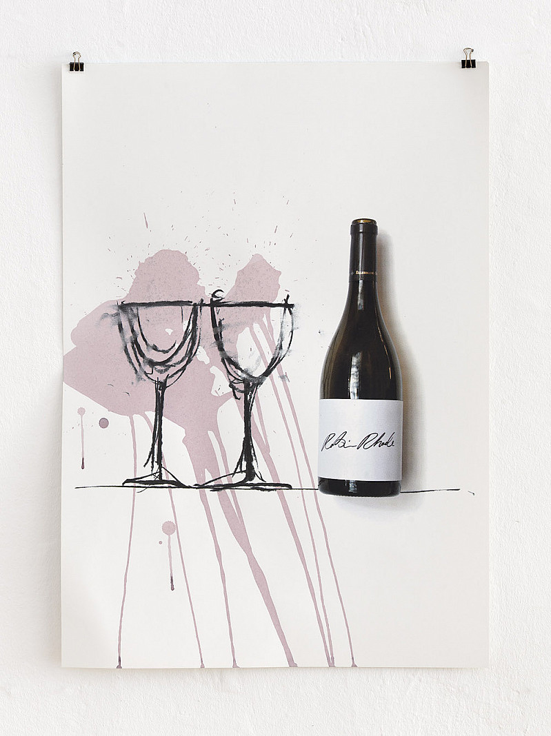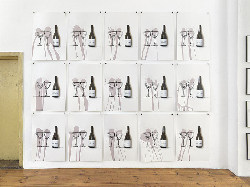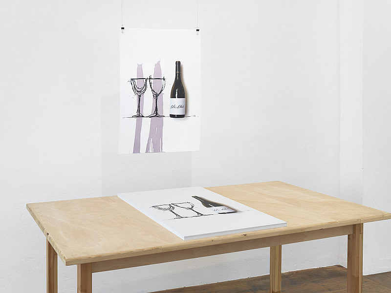 "What remains", could be the question of the silkscreen print by Robin Rhode. The manifestation of gesture- the pouring of wine into a wine glass- sprawls here through mediallayers. As in many of his socially critical works, in this work Rhode starts with a charcoal draft, which is then extended into a space by using props and live action. first the photography of a wine bottle and the drawing of two glasses dominate the sheet. only the wine stains on paper give us an idea of the last step of the performance, pouring wine into drawn wine glasses. the gesture seems to sway between blatant spillage and extravagant casting. Questions that address the traces of social gestures and their permanance in media, fictitious and real spaces become relevant.