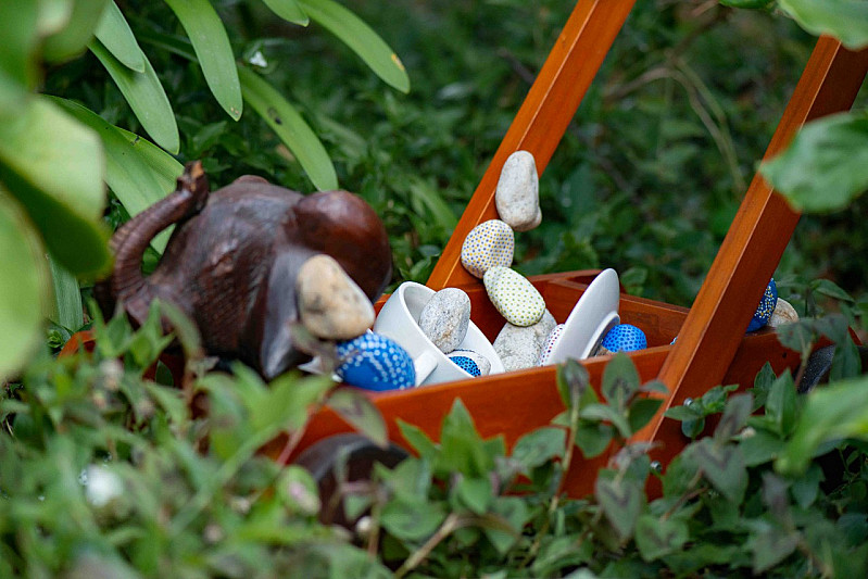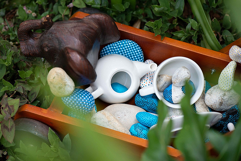 The tea set in the wooden trolley becomes representative of my middle childhood, a period of change and transition, a confusing time where I was torn between wanting to imagine fictional scenarios and societal norms. The undecorated rocks are placed amongst the painted rocks, which seem at home within these charming staged scenes, creating a juxtaposition which was very much felt at this period within my life.