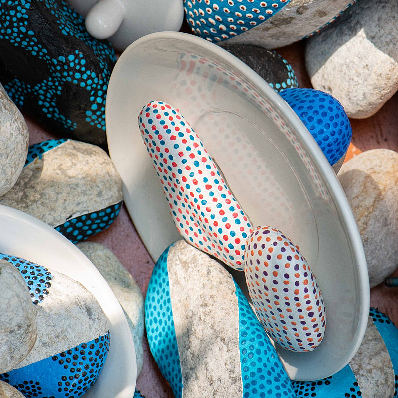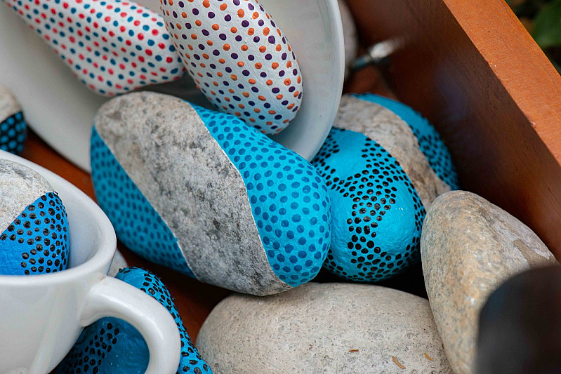 This artwork is the first work within the second series making up this exhibition, called Metamorphosis. This series is comprised of both decorated and undecorated rocks which are placed alongside treasured items from my childhood used to set scenes when playing make-believe.