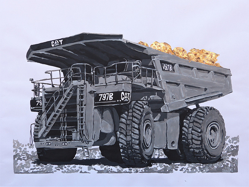 “Load bearing”- (2020) is a gauche painting that depicts a mining truck carrying a load of gold – This work alludes to how Johannesburg got its nickname. Being a city rich in resources, especially in the gold mining industry, earned the city its name. This work, the first in my body of work, introduces the theme and topic as a whole.