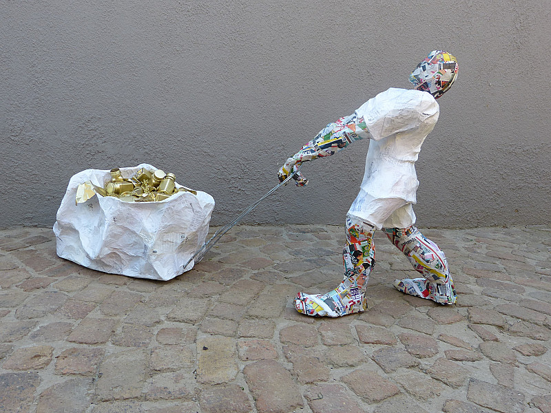 The final work “Fool’s gold” depicts a scene commonly observed on a daily basis on the roads of Johannesburg, of an individual dragging recyclable waste on a make shift carrier. Having sculpted this work with till slips, shows how Johannesburg was built on money and how its inhibitors live in a money driven society. This work again comments on what a resident of Johannesburg finds valuable, and alludes to the familiar phrase ‘one man’s trash is another man’s gold’.