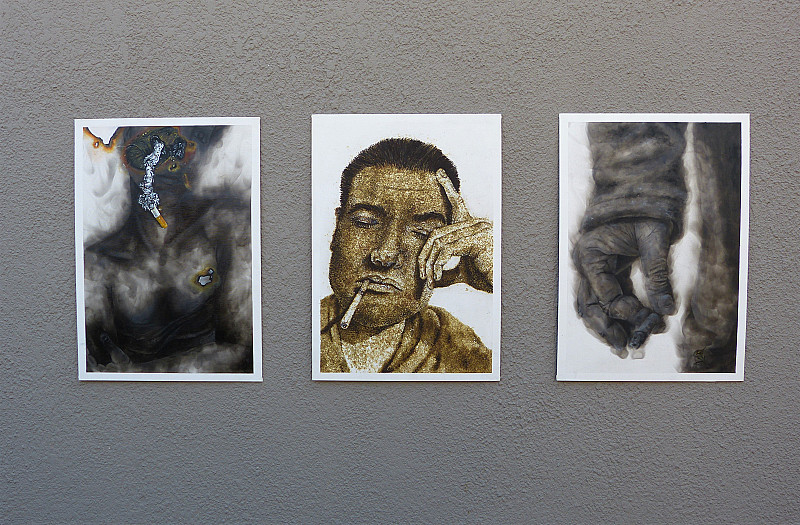 The smoke series comprises three canvas boards that have physically burnt either through the smoke of a candle or through gun powder. Both methods allow an imprint of the burn onto the page that leave behind the image of the work. All the works in this series highlight the value and importance of cigarettes within the socio-cultural city life of Johannesburg. The work “when people zol”- (2020) reflects back on the time when cigarettes were banned during the level 5 lockdown within South Africa; This ban affected many individuals and this work highlights how smokers were left feeling vulnerable without their fix. “Smoking gun”- (2020) has a sense of irony as the work was created from burnt gun powder and comments on the dangers of smoking, not only during the Covid-19 period but also the health dangers associated with smoking. Last in the smoke series “sharing is caring” captures a scene of a hand slyly offering a cigarette to you; the viewer. This work comments on the under the table distribution of cigarettes that took place during the ban. These works are intended to make the viewer critically consider their own perspectives and role within this context, as well as ponder what the deeper social implications are of prohibitions during a crisis period.