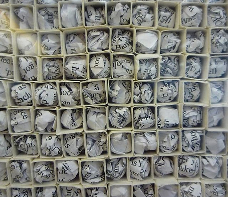 collection of love song lyrics crumpled up in 1cm x 1cm x 1cm blocks